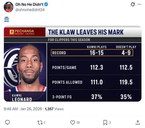 因此小卡是否出战影响巨大,当他出战时快船队17胜15负,但他缺席时战绩跌至4胜9负。